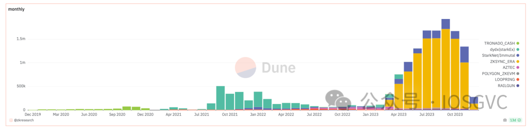 这张由Near团队制作的图表展示了zkSN(T)ARK在以太坊及L2s上的燃料消耗情况。它包括了像zkSync、Polygon、Aztec、Tornado Cash、Loopring、Worldcoin、Tailgun、Sismo、StarkNet和ImmutableX以及dydx等流行的ZK项目。