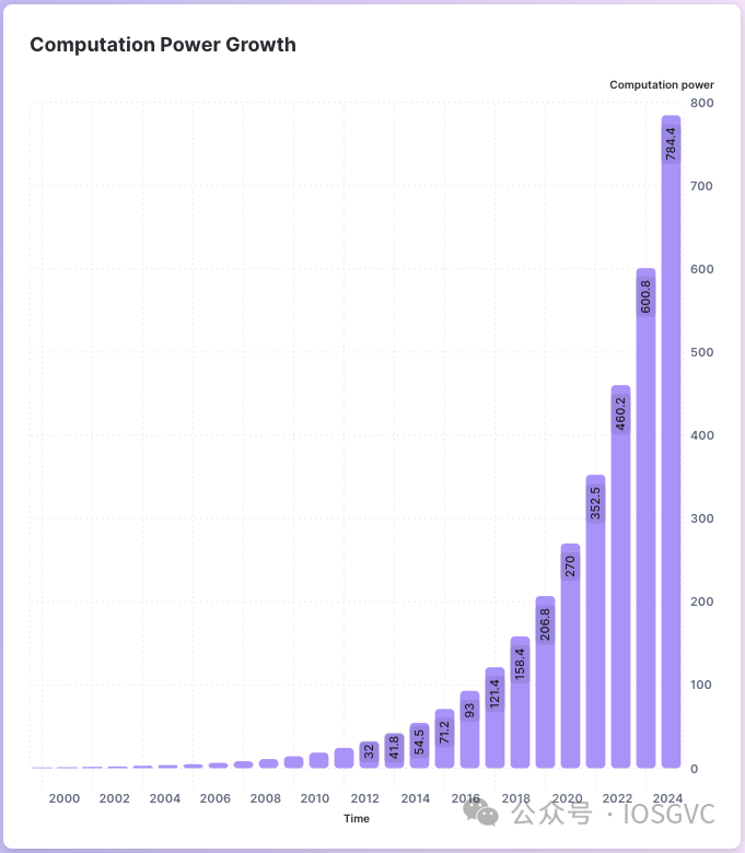 下图根据库默伊定律描绘了基于年份增长的计算能力图表。2000 年之后每十年芯片效率提高 10 倍。如果我们以 2000 年为基准对比计算能力,在2025年将达到784倍。这也表明当前 ZK 计算与 2000 年相比仍然不在一个数量级上。