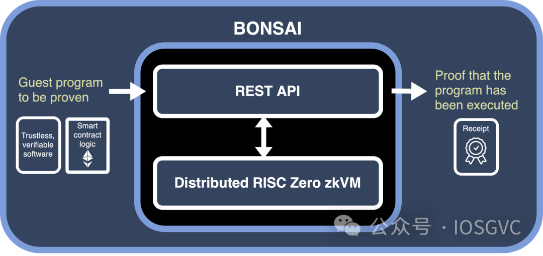 Risc Zero 利用它们的 zkVM 启动了 Bonsai。借助 zkVM 的力量,用户可以让 Bonsai 生成各种声明。例如,基于 Bonsai 和 Risc0 VM,Zeth 为以太坊区块生成证明。Source:https://www.risczero.com/