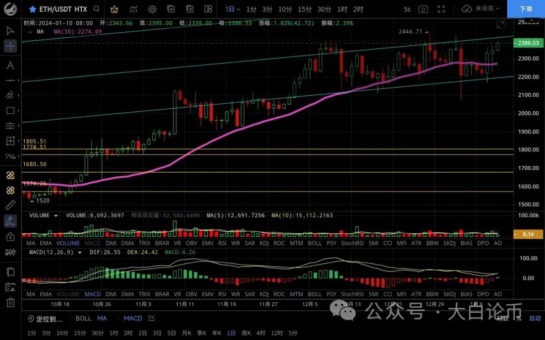 以太坊日内走势比大饼强势,昨日整体呈震荡下行最低跌至2227一线支撑反弹,凌晨多头发力加速拉升,最高触及2395一线受阻回落,恭喜跟上昨日思路的朋友多单获利140点,目前比价在2385附近运行,四小时级别k线连阳拉升突破前高,macd呈多头到没有明显放量双线金叉状态,短期行情暂时滞涨,但回踩力度不大,整体还是偏向多头,上方关注2400阻力区域,不破的话预计白盘将持续震荡直到消息面公布,日线级别k线大阳拉升可见多头强势,macd有金叉迹象,若能站稳2400预计会走出新的突破,目前还是围绕消息面来进行操作,稳健者观望即可,上方压制2440-2530,下方支撑2330-2280