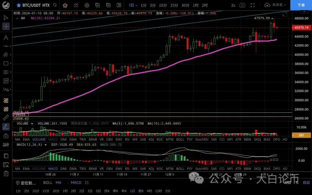 大饼昨日白盘呈震荡修复状态,低位跌至45500附近支撑反弹,凌晨行情拉升最高触及47980一线受阻迅速回落,恭喜跟上昨日思路的朋友多单获利2000点,目前币价在46040附近运行,四小时级别价格虽突破前高但未能站稳迅速回落,k线收大阴上下均有影线,可见多空博弈力度都挺强,macd多头逐步缩量双线拐头向下有高位死叉迹象,短期来看上涨受阻有回调需求,预计力度不会太大,日线级别价格正好回踩至ma7均线支撑,整体仍是多头走势,是否能延续还是需要重点还是关注消息面,若利好很有可能先跌后涨,今日行情会很刺激注意做好风控,思路建议回踩低多为主高空为辅,稳健者观望,上方压制47000-48000,下方支撑44800-43300