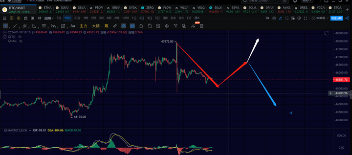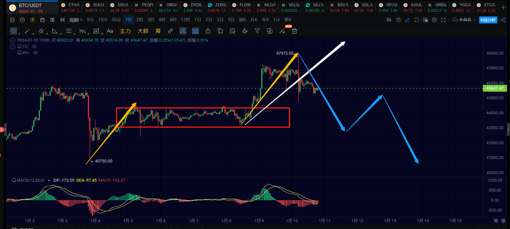 4小时级别:方向向上,若跌破44000,则4h反弹大概率就结束了