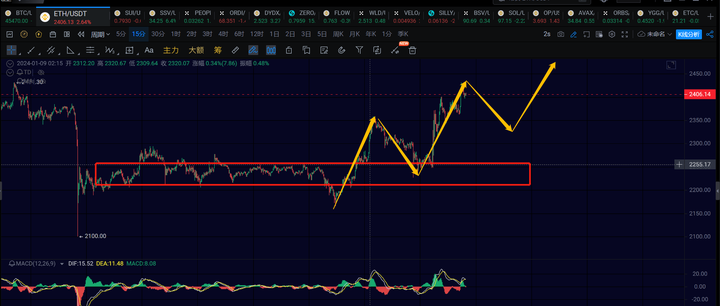 以太的1h级别中枢离开段的反弹成功走出来了,目前最高到了2431,离2450的新高还差了一点。目前主要看短线15分钟级别的回调是否能够在2300上方稳住了,稳住应该还会有一笔15分钟级别的反弹去新高。但是2300附近稳不住的话,就要考虑从2100开始的4h级别的反弹可能直接结束了。短线上还要进一步结合消息面。