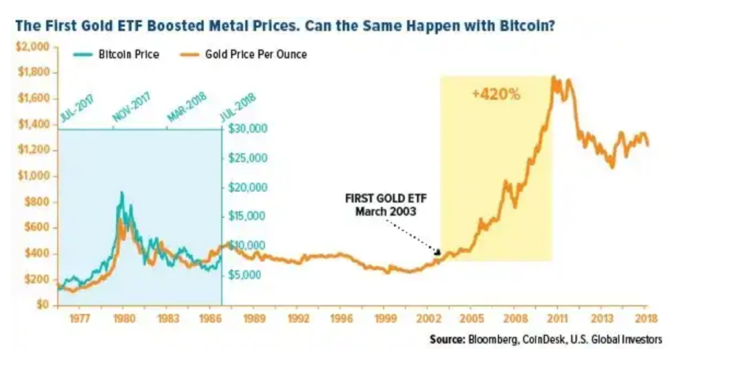 我们以黄金作为参照,首支黄金 ETF SPDR Gold Trust(GLD)于 2004 年在美国上市,在上市后的一年内,黄金价格上涨了 25%,而接下来 5 年,黄金更是上涨了 500%。