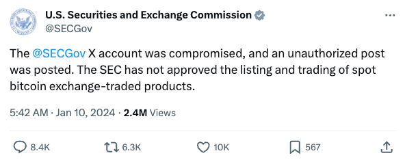 1 月 10 日凌晨,就在市场对现货比特币 ETF 申请的最终结果翘首以待的时候,美国证券交易委员会(SEC)却闹了一个大乌龙——SEC X 账户离奇被盗,并发布「比特币现货 ETF 获批」假消息。
