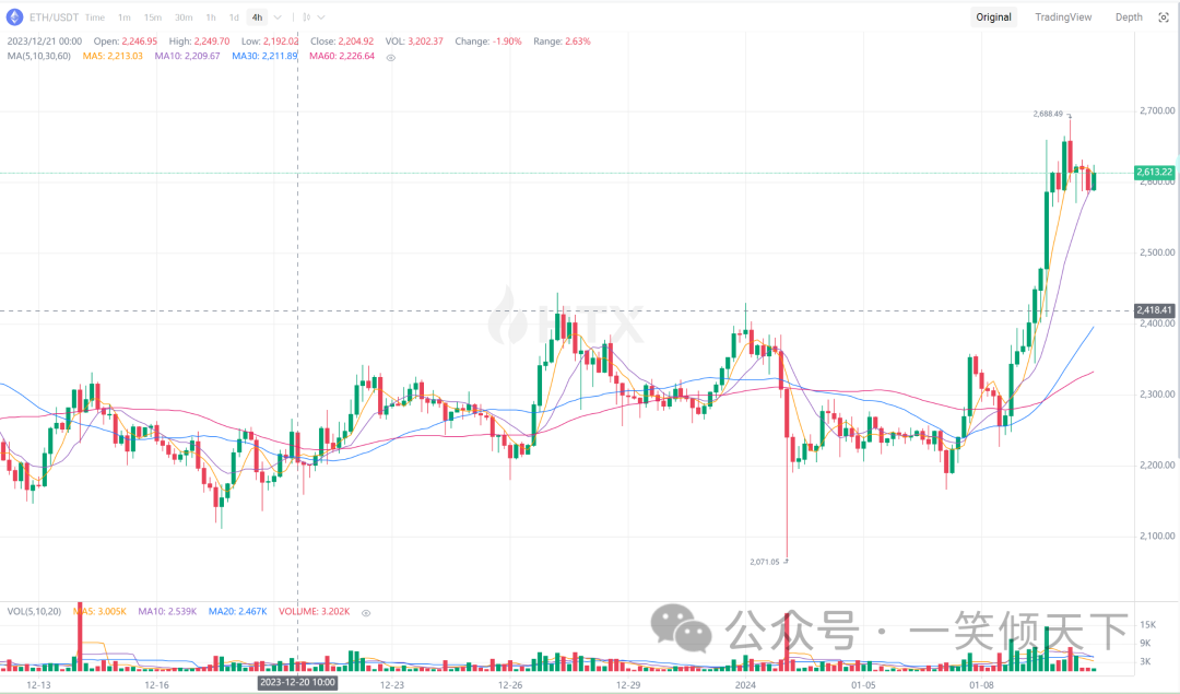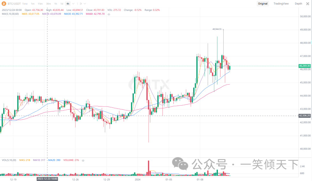 现货etf已经通过,后面还有减半,降息等利好,确定了24年的看涨的大基调,大基调看涨不代表能一直涨,这个要能理解。会到今天的盘面,比特币冲高回落,五万附近的压力还是大,需要时间调整才有机会突破,再加上etf利好的落地,短线可能会有相当一部分人认为利好落地成利空,所以短线多空较量会很激烈。花哥认为,大家只需要记住一个点:24年行情一定不会差,大跌就是机会,逢低布局,坚定持有,一定会赚钱的。另外,以太坊etf和坎昆升级依旧会被资金炒作,回调建议关注。