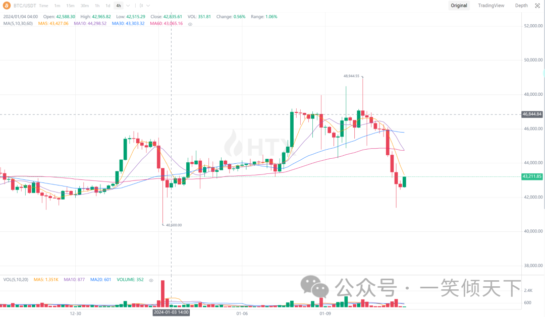 比特币昨天就分析,etf利好落地会引起短线激烈的多空碰撞。因为有的人认为etf通过是利好,有的人认为etf通过利好落地成利空。短线走势来看,短线是空军获胜,花哥认为短线并不影响长线,长线来看etf是长期的利好。回到今天的盘面,经过比特币这么一跌,比特币重新回到震荡区间,接下来关注40000的中线多空分界线,不破40000震荡调整之后还能涨,但破了40000会引发中线调整,但也会给很好的上车机会。花哥提示大家2024年不怕跌,跌是机会!