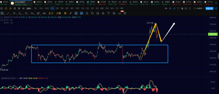 15分钟级别反弹压力2650,下方支撑2400~2430附近。以太基本上也差不多要进入日线回调了,情况好点后面再破个高点后回调,情况差点后面反弹过不了前高继续下跌。