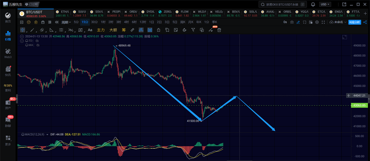 15分钟级别:方向向下,短线15分钟级别反弹不破44500的情况下,还会有一笔15分钟下回踩低点附近