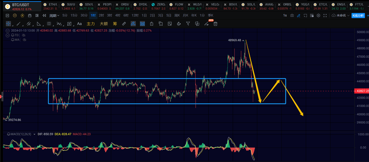 1h级别,大饼当前还在运行1h级别的下跌,这笔下跌看着应该还没有结束,短线如果反弹不能突破44500的话,预期还会再次回踩41500或者41000附近。然后明后天应该会走第二笔1h级别的反弹,反弹阻力在44500附近。之后再走第三笔1h级别的下跌,第三笔下观察是否直接破40000。