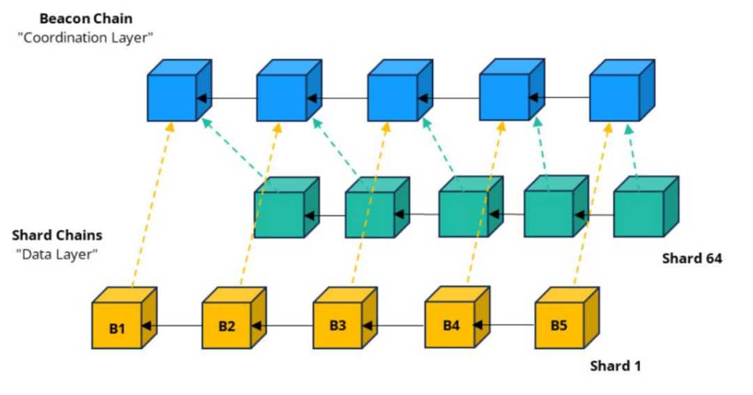Dencun 升级的核心之一即 Proto-Danksharding 模块的引入。Proto-Danksharding 也是为了以太坊最终的分片扩容做准备。最早的以太坊扩容计划是打算将以太坊分割成不同的分片,把主网的计算负载分配到各个分片中,每个独立的分片各自保存以太坊上发生的交易数据的子集,并行地处理交易,从而提高以太坊的 TPS。最初的 ETH2.0 计划最终将主网划分为 64 个分片以实现 10 万+ 的 TPS。