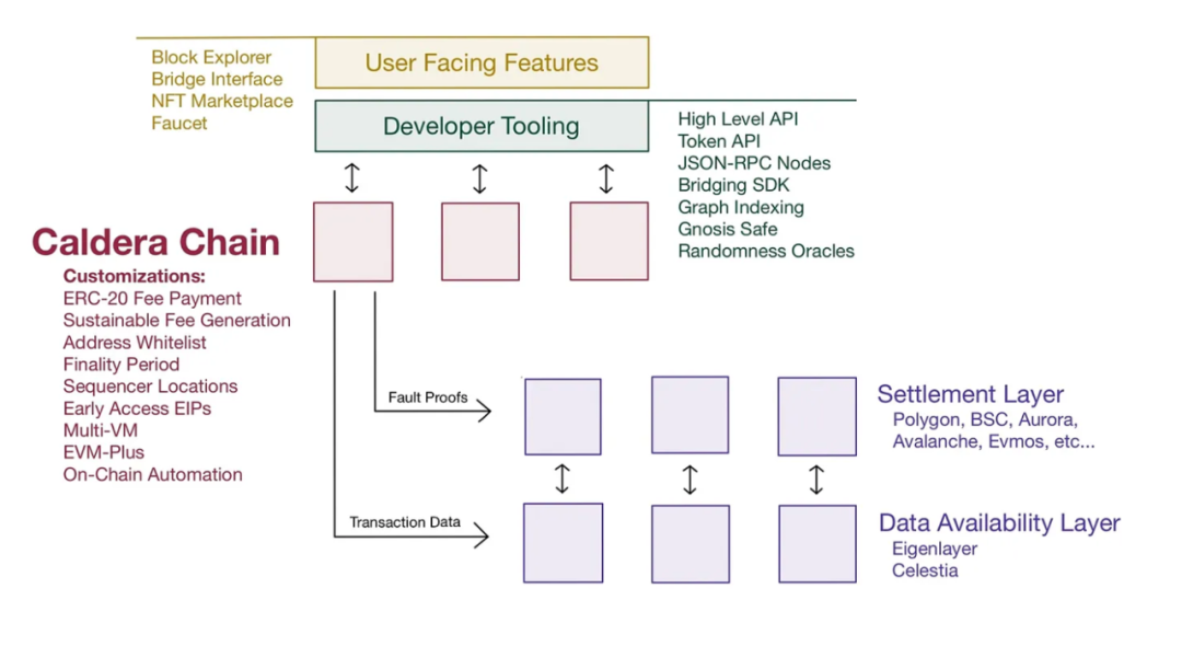 Caldera 是基于 OP Stack 搭建的 RaaS 服务提供商,支持以无代码的方式为用户快速地搭建起一条 Optimism L2。使用 Caldera 发行的 L2 能够实现完全的 EVM 兼容,能够极大地降低开发者的开发门槛,有利于直接复用现有的 EVM 生态项目,从而为 L2 提供更为完备的基础设施。除了 L2 本身,Caldera 还为用户配置了一系列的区块链基础设施,例如区块链浏览器、测试网水龙头等,从而进一步降低发链成本及使用门槛,即插即用。