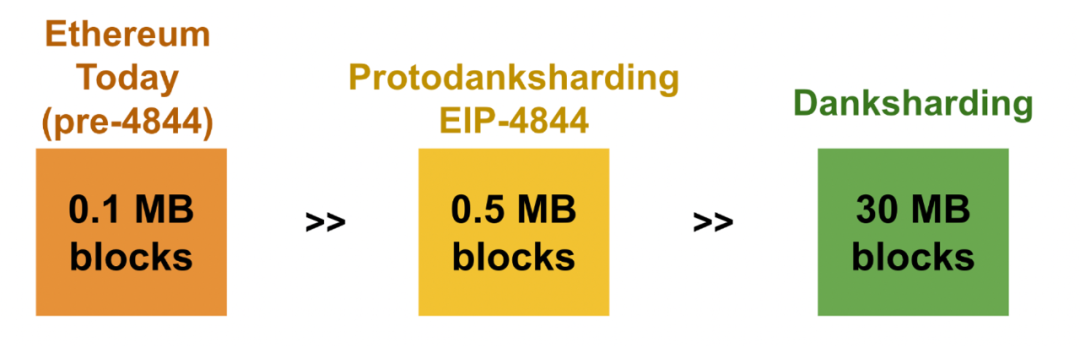 Proto-Danksharing 所引进的每个 blob ⼤⼩为 128 KB,每个以太坊区块计划包含 3-6 个 blob(0.375 MB - 0.75MB),未来逐步拓展至 64 个。