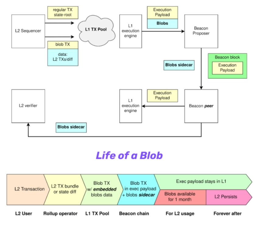 Proto-Danksharing 将会在以太坊区块中引入一种新的数据存储结构:blob。blob 将专门用于存储 L2 向 L1 提交的交易数据。