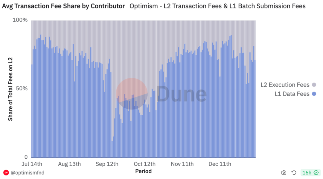 此前,以太坊 L2 的所有交易都被存储在 L1 的 Calldata 中。而 Calldata 本身的空间大小就相对有限,并且 Calldata 上所有的数据都会被以太坊节点处理并永久存储于链上,这就导致了高昂的数据可用性成本。理论上而言,L2 的交易数据并不需要永久存储于昂贵的以太坊 L1 上,仅需存储一定的时间满足欺诈证明等验证需求即可。换言之,以太坊 L2 的交易数据在过去是缺乏合适的存储空间的。从数据上看,L2 80% 的交易成本以及 Gas 费用均来自于 Calldata 中昂贵的数据存储成本。