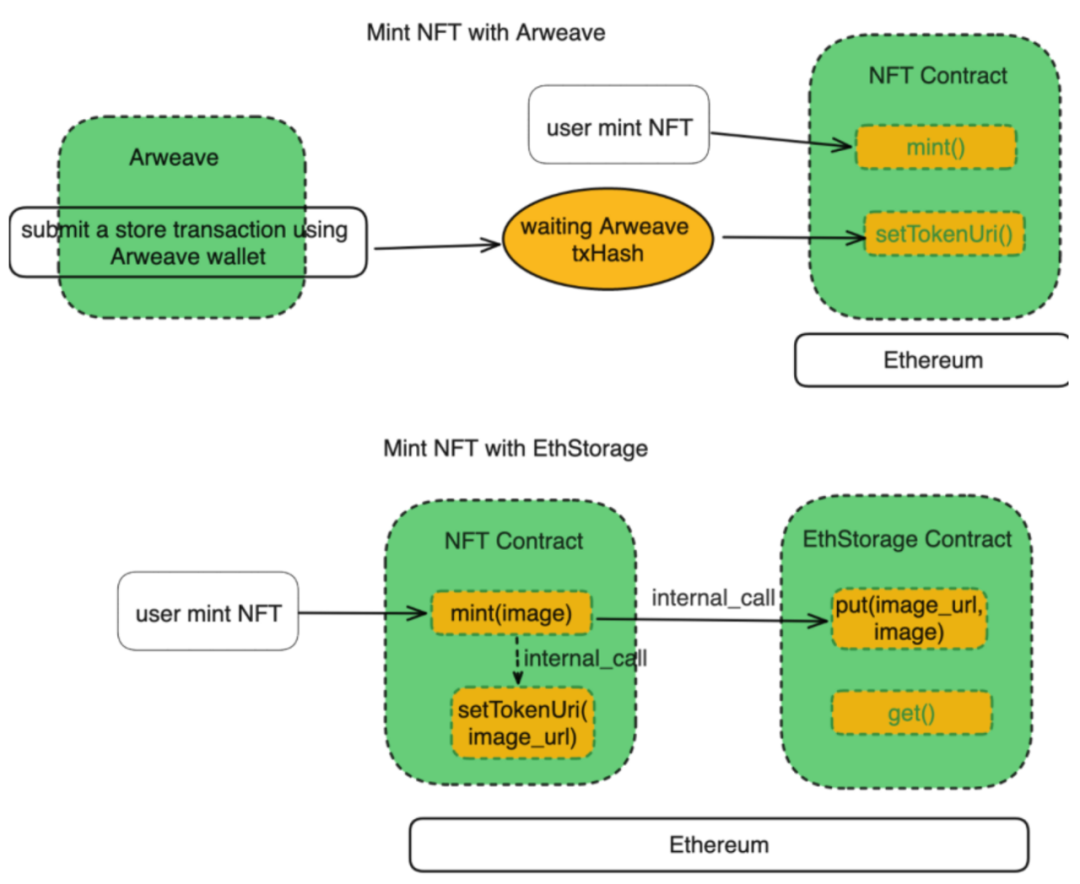 并且 ETHStorage 与 EVM 的互操作性更强,能够实现与 EVM 的完美兼容。以 Mint NFT 图片为例,将存储在 Arweave 上的图片 Mint 为以太坊上的 NFT 图片需要三次智能合约操作,而 ETHStorage 仅需一次就能完成。