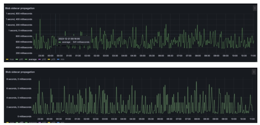 blob 会在小于 2s 的时间内传播到 95% 的节点,平均情况下,大多数 blob 在 500 毫秒内即可通过完整的网络传播。理想情况下,区块的传播时间预计会增加约 250 毫秒。