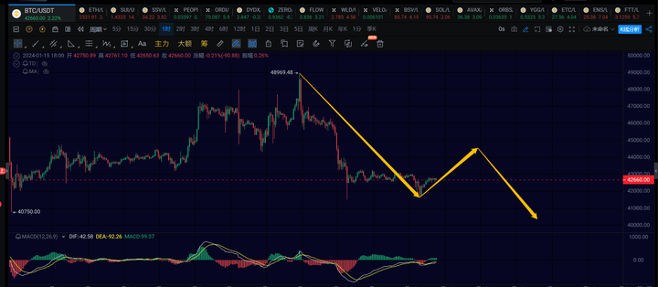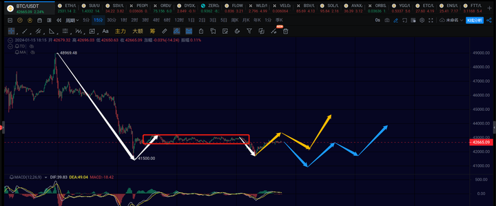 或者这里如果不能突破43000的话,可能再走一笔15分钟级别的下再次回踩41500,然后再走1h级别,如蓝色箭头那样。