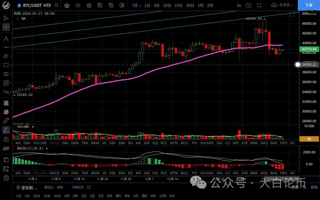 大饼昨日白盘一路反弹上行晚间最高触及42960一线后迅速回落,跌至42160一线支撑再次反弹,恭喜跟上昨日思路的朋友,目前币价在42630附近运行,四小时级别行情整体呈震荡走势,上方受ma200压制,macd虽呈多头金叉状态,但反弹力度不强,预计突破的概率不大,短期将维持震荡走势,若能站稳43000上方则有机会打破短期震荡,日线级别来看ma60再次支撑,行情虽走出反弹但未能站稳再次回落,若日线收阳则下跌行情止跌,反之会继续试探4w关口,整体走势变化不大建议高空低多对待,上方压制43000-43500,下方支撑42000-41500