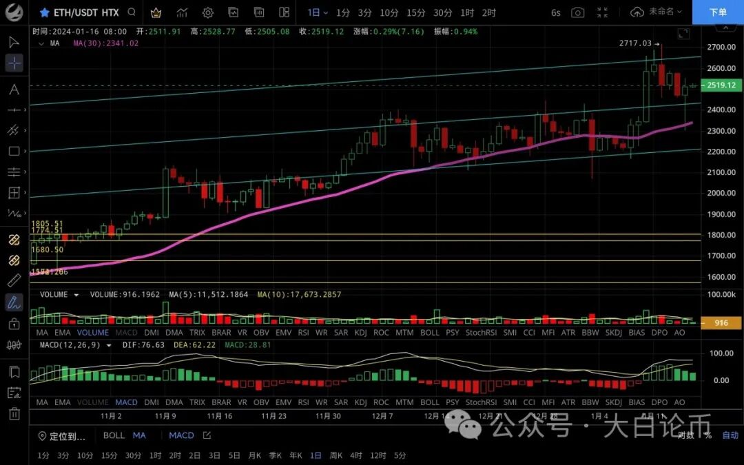 以太坊昨日走势与思路一致呈反弹上行,最高触及2553一线受阻回落,低位跌至2500附近,恭喜跟上昨日思路的朋友,目前币价在2520附近运行,四小时级别行情再次反弹但未破前高,短期高点逐步降低,整体受制于ma14下方,k线收阴,macd空头运行双线死叉向下,短期来看突破的概率不大,预计还有下行的可能,关注前低上方2480附近有支撑,日线级别行情反抽至ma7均线受阻回落,多头逐步缩量,上攻力度较弱,有形成上影线的需求,若破位前低则关注2400区域,思路建议高空低多对待,上方压制2550-2570,下方支撑2500-2460