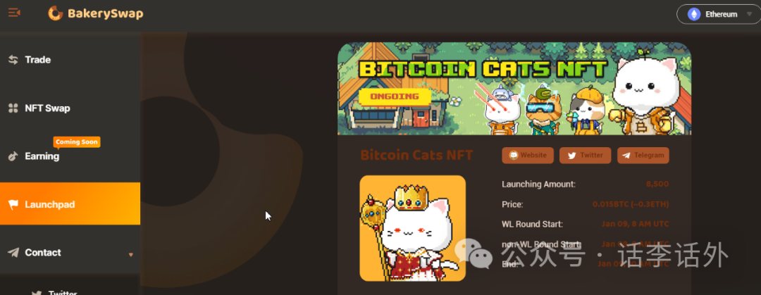 另外比较值得一提的是,目前该平台的 Launchpad 还搭上了 BRC20 的顺风车,他们首次选择进行 IDO 的项目是比特币链游项目 Bitcoin Cats(该项目的Cat代币是BRC20代币,同时也是ERC20代币)。