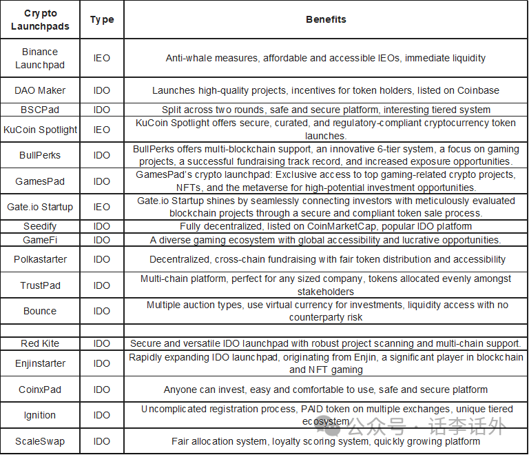 当然,我们上面梳理的也只是该领域中的一部分 Launchpad,并且我们也略过了一些众所周知的 Launchpad 项目,比如 Binance Launchpad 等。对 Launchpad 感兴趣的小伙伴可以在此基础上去做进一步的了解和研究。