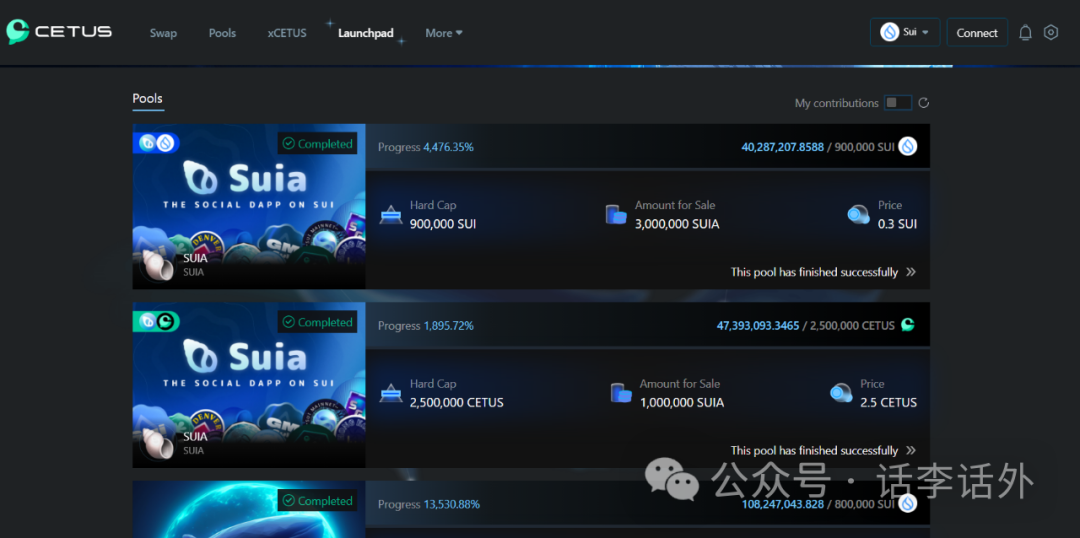 CETUS 是 Cetus 的代币,其 50% 用于激励流动性Wa矿,同时也会通过 Launchpad 来上线其他协议代币,来给 CETUS 的代币赋能。Cetus 会分为白名单用户和普通用户,白名单用户是针对 xCETUS 的持有者,也就是说,拥有 XCetus 的人就可以获得 Launchpad 上面所发行新的项目的代币的抽签权和白名单。如果想要参与的话,你需要至少 10 个 SUI 或 100 个 CETUS 代币。