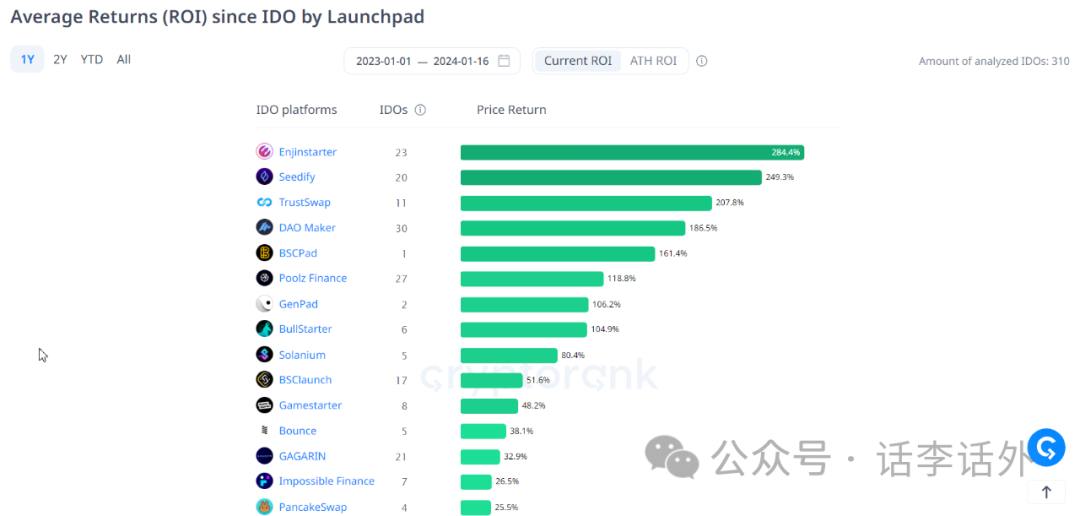 但同时为了维持代币的价格走势并促进其交易量,项目方通常也需要额外的资金(比如一定数量的ETH或BNB),因为它需要在流动性池中使用另一种等值的加密资产。而就 IDO 的整体回报率情况来看,与上面提到的 IEO 还是有挺大差距的。如下图所示。