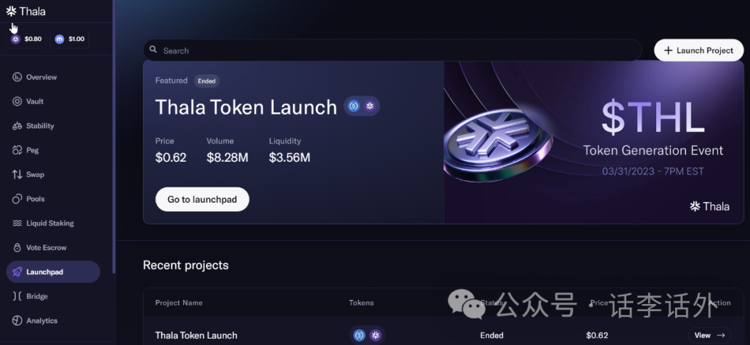 ThalaLaunch 是一个 LBP(Liquid Bootstrap Pool、流动性启动池,也被称为荷兰式拍卖)代币启动板,利用 ThalaSwap 的流动性来实现公平分配和有效的价格发现。ThalaSwap 基于 Balancer 模型所设计的 AMM DEX。MOD 是一种超额抵押和去中心化的稳定币。