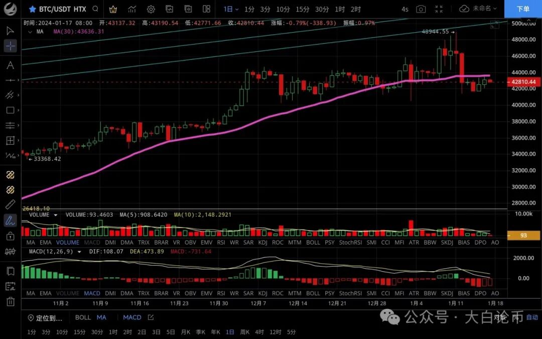 大饼昨日白盘呈碎步上涨走势晚间加速下跌至42060附近支撑反弹,最高触及43560一线受阻回落,恭喜跟上昨日思路的朋友多单获利1500点,目前币价在42870附近运行,四小时级别行情再次插针触及ma200均线受阻回落,底部支撑逐渐抬高,macd多头无量运行双线金叉向上,若回踩不破42500还是会继续试探上方压制,短期没什么变化仍是震荡走势,日线级别来看行情整体被ma60均线支撑,虽收阳线但反弹力度不大,ma7向下指引,macd空头逐步放量双线死叉向下,整体走势偏弱,预计后市会回踩4w关口,思路建议逢高做空为主低多为辅,上方压制43300-43600,下方支撑42000-41500