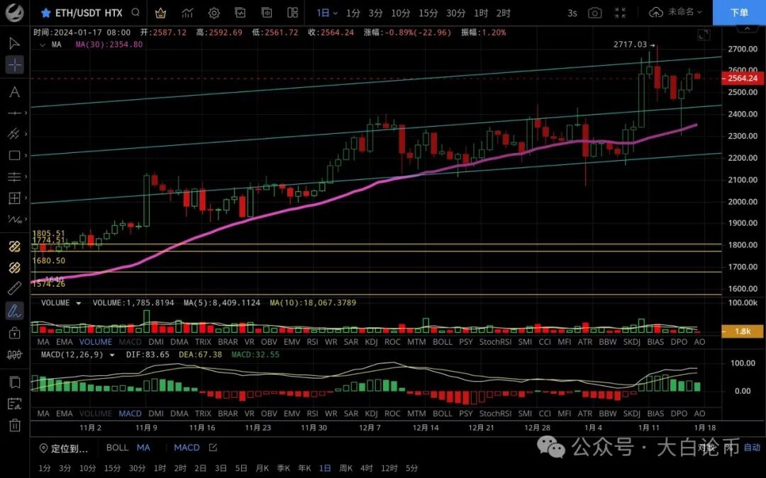 以太坊昨日走势与大饼一致呈震荡上行,晚间低位回踩至2500一线后支撑反弹,最高触及2612一线受阻回落,恭喜跟上昨日思路的朋友多单获利100点,目前币价在2570附近运行,四小时级别k线收上影后走出一波回踩但受ma7均线支撑空头下跌暂缓,macd无量运行双线呈粘合状态,短期走势缓慢没什么方向,整体以震荡为主,关注2540支撑情况,日线级别昨日价格再次收回ma7附近,且走出一波冲高,但多头却没能站稳,若能收线在ma7下方预计后市会开启回调走势,思路建议逢高做空为主低多为辅,上方压制2600-2620,下方支撑2540-2500