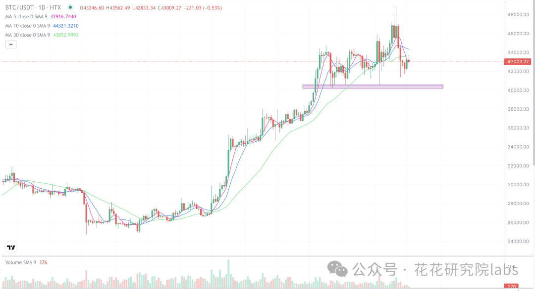 比特币这两天的走势很弱,四小时在小区间41500-43500之间调整,小短线可以在这个区间高空低多自行操作。中线走势40000i就是多空分界线,不破40000调整之后继续涨,破了40000进行中期回调,然后再涨。不管哪种走势,都不会影响24年的牛市行情,24年保持低买持有的策略,25年你会回来感谢花哥。