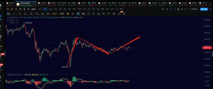 以太和大饼差不多的,这里1h级别的反弹还差一波反弹去2500上方,如果反弹到了,说明1h反弹就成功的走出来了。再往上就看2575了,能到这里,那么以太就有较大概率走4h级别的反弹,到不了那就注意后续是否再次跌破2400。