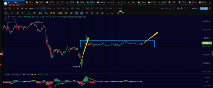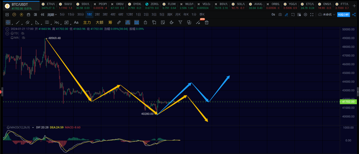 大饼这里短线目前还是倾向于1h级别的反弹没有走完,如果再去一趟42000上方,那1h级别的反弹结构就比较完美了。近期行情走势运行的比较缓慢,不要着急,需要耐心等结构走完整。