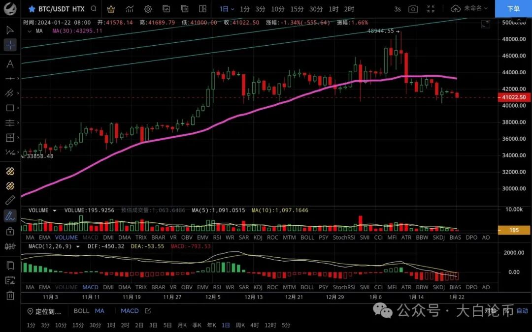 大饼昨日行情波动不大整体呈震荡走势,高位触及41870一线受阻,随后震荡下行,最低跌至41064一线支撑,恭喜跟上昨日思路的朋友空单盈利,目前币价在41200附近运行,四小时级别行情再次触及ma30均线受阻,k线连阴下行,macd多头缩量双线粘合,短期走势空头还未止跌仍有下行的风险,下方先关注40500-40000,若跌破4w关注38000可以分批抄底,日线级别整体呈震荡下行走势,碎步反弹大阴下跌,可见空头力度强势,思路建议反弹高空为主低多为辅,上方压制41800-42300,下方支撑40300-40000