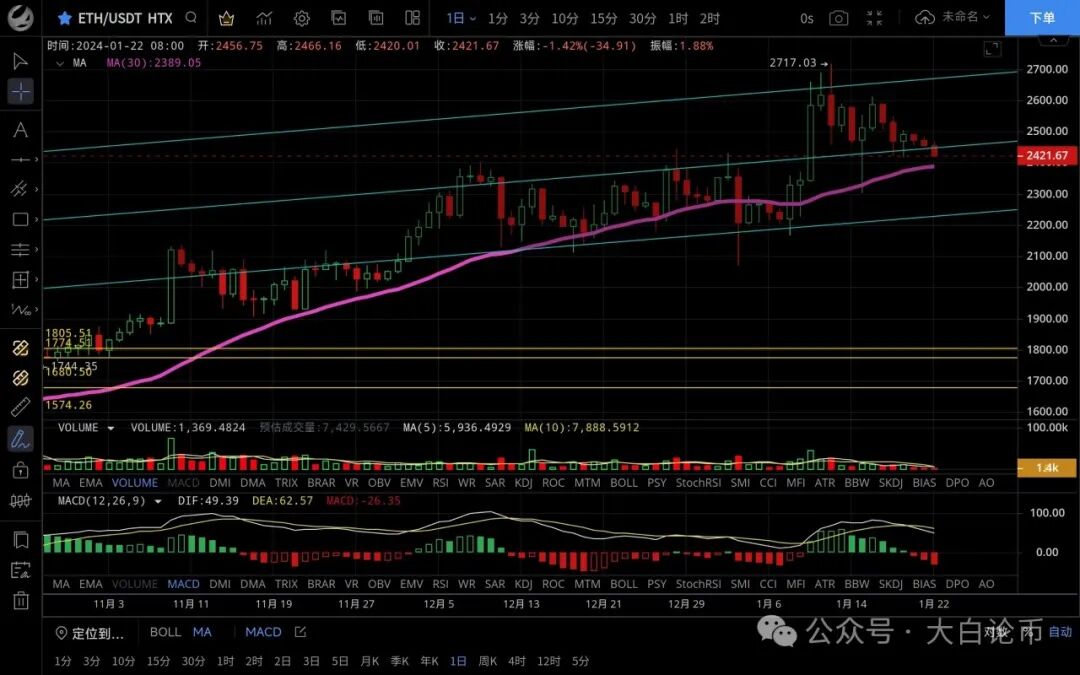 以太坊昨日走势与大饼一致,整体呈震荡走势,凌晨空头发力连阴下行,最低跌至2424一线支撑,恭喜跟上昨日思路的朋友空单获利,目前币价在2427附近运行,四小时级别行情横盘震荡后选择下行,k线三连阴,macd空头逐步放量双线有死叉迹象,短期走势空头没有止跌还有下行的需求,关注2400关口支撑情况,预计会有一波插针迅速反弹,激进可以抢一波,日线级别整体呈下行走势,日内有试探ma30的风险,macd空头逐步放量双线死叉向下,整体走势较为弱势,下跌不可怕这样才有机会抄底,以太坊市场是好的,只不过暂时被大饼拖累了,日内思路建议回踩支撑后先多后空,上方压制2450-2480,下方支撑2400-2350