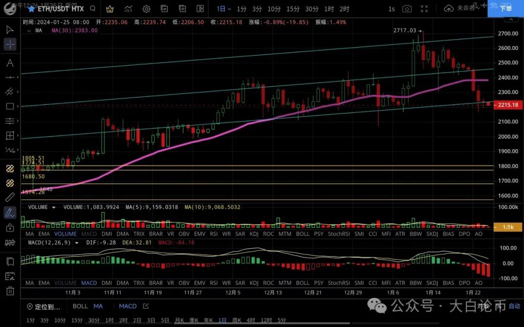以太坊整体走势较弱,昨日最高反弹至2264一线受阻回落,低位跌至2196一线,恭喜跟上昨日思路的朋友空单获利50点,目前币价在2216附近运行,四小时级别反弹力度不大,整体处于震荡修复阶段,上方受ma14压制,行情再次回落,macd空头转多双线成粘合状态,目前来看空头占优还有下跌的风险,二次下探不破前低的话可以分批进多,日线级别来看整体处于ma90均线上方运行,但反弹力度薄弱,macd空头逐步放量双线死叉向下延伸,短期走势偏向于空头,下方空间有限,大方向依旧看涨下跌就是机会,思路建议回踩低多为主高空为辅,上方压制2250-2280,下方支撑2180-2150