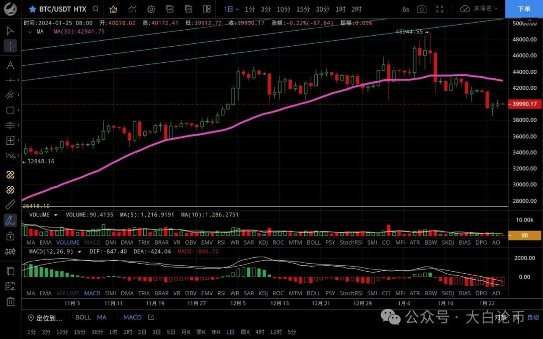 大饼昨日一路反弹上行最高触及40550一线受阻回落,低位跌至39500一线,恭喜跟上昨日思路的朋友空单获利800点,目前币价在40040附近运行,四小时级别行情收针回踩但始终没能跌破ma14可见支撑力度挺强,macd多头运行双线金叉向上,价格重回40000上方运行,虽反弹力度较弱,但整体在缓慢上行,处于震荡修复阶段,若能突破站稳40200上方关注力度及延续,日线级别底部抬高,空头止跌逐步缩量,短期有企稳迹象,日内思路建议低多为主高空为辅,上方压制40500-41000,下方支撑39500-39000