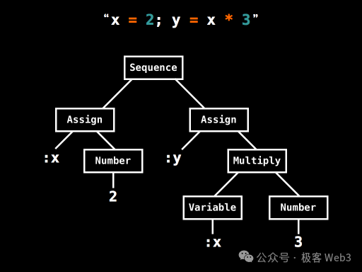 (一个AST树的简单案例,这棵AST树将x=2,y=x*3 这样的简单运算,细分为了底层操作码+数据)