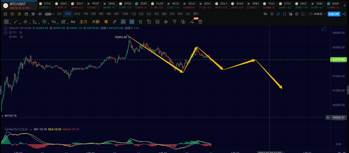 1h级别,当前应该是在运行第二笔1h级别的回调了,因为今天上午的15分钟级别反弹没能再破42842,所以直接看一笔1h级别的回调。这笔1h级别的回调关注41200或者40500附近。等这笔1h级别的回调走完以后,预期还有第三笔1h级别的反弹去43500附近。