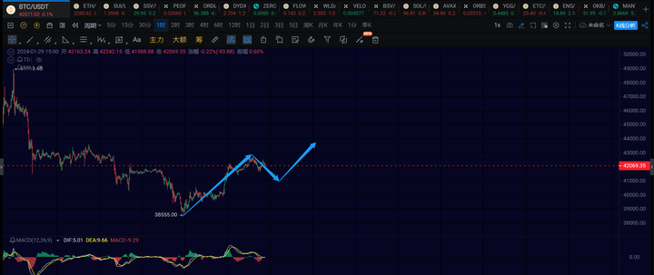 4小时级别:方向向上,目前走第二笔4h级别的反弹,预期目标看43500~44000附近