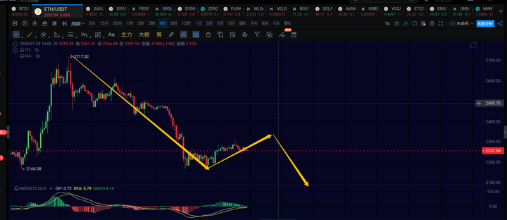 以太4h级别反弹,想要去2400的话,看着还是有些费劲,走的比较弱势。短线观察1h级别回调能否在2200~2220区间稳住,这里能够稳住的话,将继续看第三笔1h级别的反弹去2350附近。等这笔4h反弹走完以后,预期下一笔4h级别的下跌可能会考验2000附近的支撑。