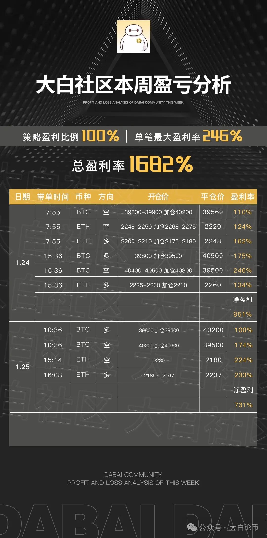 下方是大白社区本周实盘群单子,恭喜跟上的币友,如果你操作不顺,可以来试试水。
