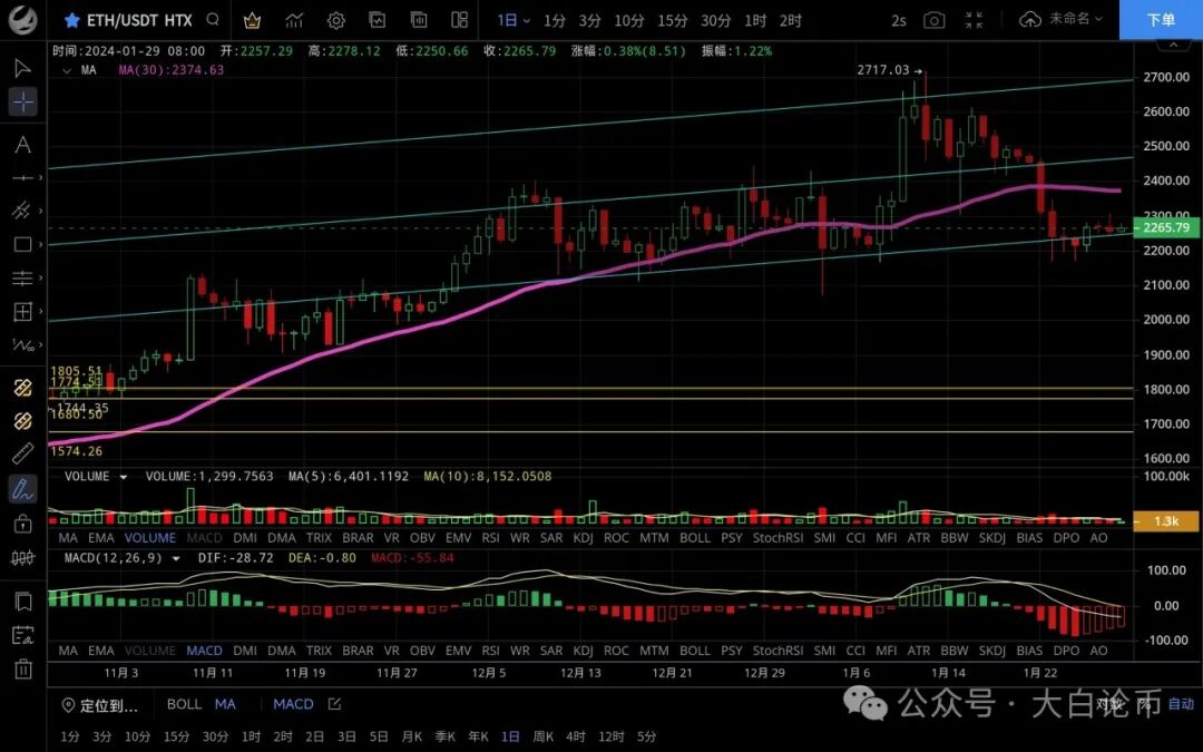 以太坊昨日走势与大饼一致,整体呈冲高回落,白盘最高触及2307一线受阻,晚间震荡下行跌至2240一线支撑,恭喜跟上思路的朋友,目前币价在2267附近运行,四小时级别回踩力度不大下方受ma30均线支撑反弹,但力度不大,整体呈震荡走势,macd无量运行双线粘合,短期走势没什么方向震荡为主,日线级别行情回踩若能支撑住行情则会继续反弹试探ma60压制,破位则会继续下跌,后市方向发展个人还是很看好的,思路建议大跌大买小跌小买,上方压制2280-2300,下方支撑2250-2220