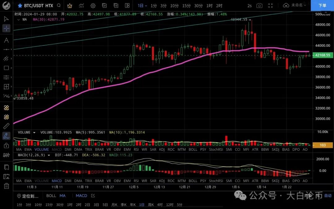 大饼昨日一路反弹突破前高至42837一线受阻,晚间行情一路震荡下行,最低跌至41612一线支撑,恭喜跟上思路的朋友,目前币价在42250附近运行,四小时级别价格回踩至ma90均线支撑反弹,但上攻力度不大,整体受ma120均线压制,处于均线内震荡,macd多头逐步缩量双线粘合,短期走势有回踩需求,但不会有太大空间,日线级别k线连阳反弹,行情回踩稳在ma14上方,后市向上突破的概率较大,个人依旧看好上行,思路建议低多为主高空为辅,上方压制42800-43300,下方支撑41600-41000