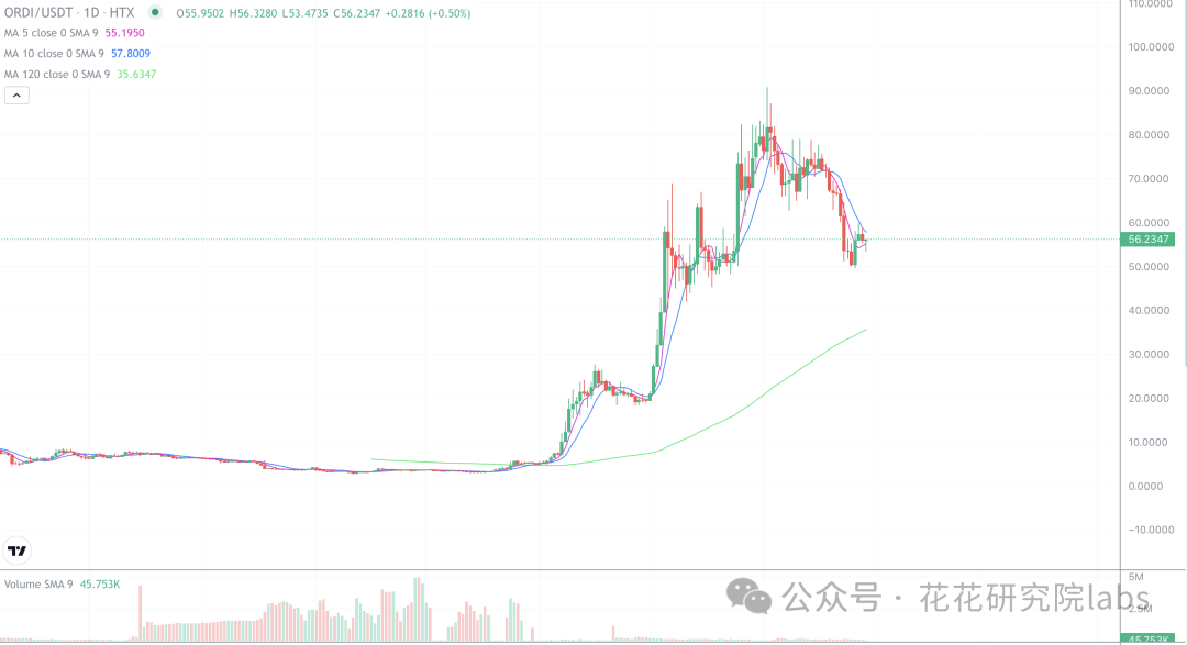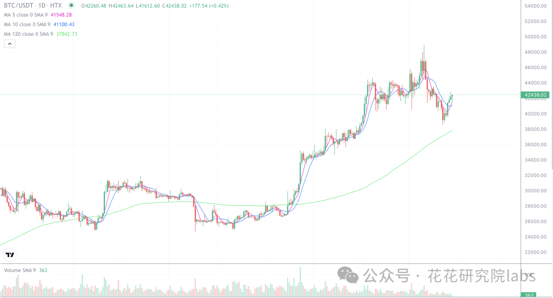 比特币最近是在120日均线上方稳住了,日线开始连续小阳线反弹,这里是有直接v反的可能,也有冲高回落的可能,短线这个位置是可上可下,唯一可以确定的是长线是看涨的,长线还是处于牛市周期,比特币目前扮演的就是晴雨表的角色,不需要它涨太多,只需要比特币稳住,只有它稳住,其他代币才有发力的机会,近期的热点板块无非就是这几个:粉丝币,币安新币次新币,铭文三剑客,以太系代币,回调都可以重点关注。比特币花哥建议长线配置,越跌越买。