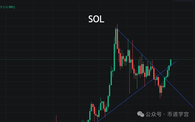 sol 回到趋势线以上,价格又单突破,因为走势脚步慢并没有出现弱回踩现象,又回到前面的密集交易区内,这才是SOL应该有的走势,在100以下的震荡是修正走势,现在回到正常走势中。