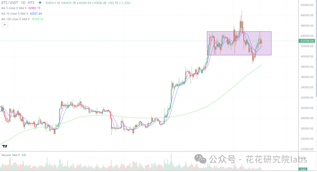 回到今天的盘面,比特币近期的走势并不强,币安上线钱包也没有带动行情,短线比特币大概率会继续在40000-45000这个区间进行震荡调整,短线行情相对难操作,建议短线休息,中长线继续找机会低吸为主