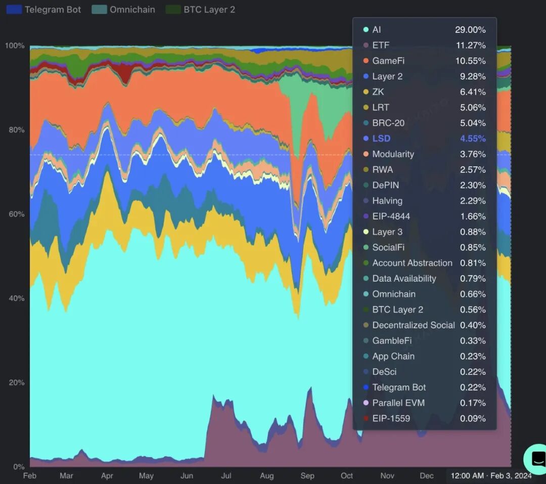 有趣的是,“BRC-20”现在排名第五,而“LRT”则迅速升至第六。“减半”只有2.3%。
