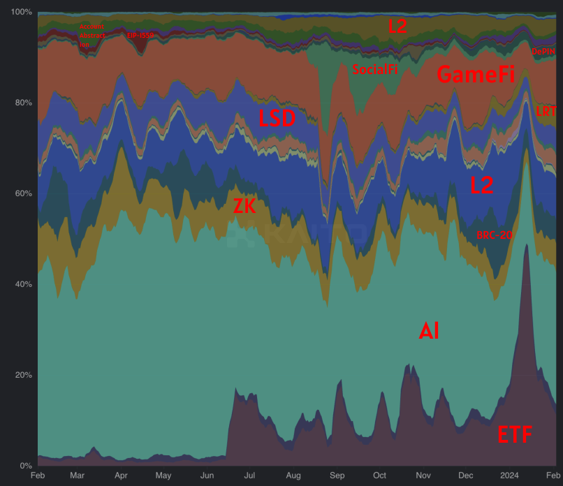 SocialFi 的炒作在 8 月至 9 月期间飙升,然后逐渐消失。就在两周前,ETF炒作达到顶峰。现在的叙事则是AI、ETF、GameFi、L2和ZK。